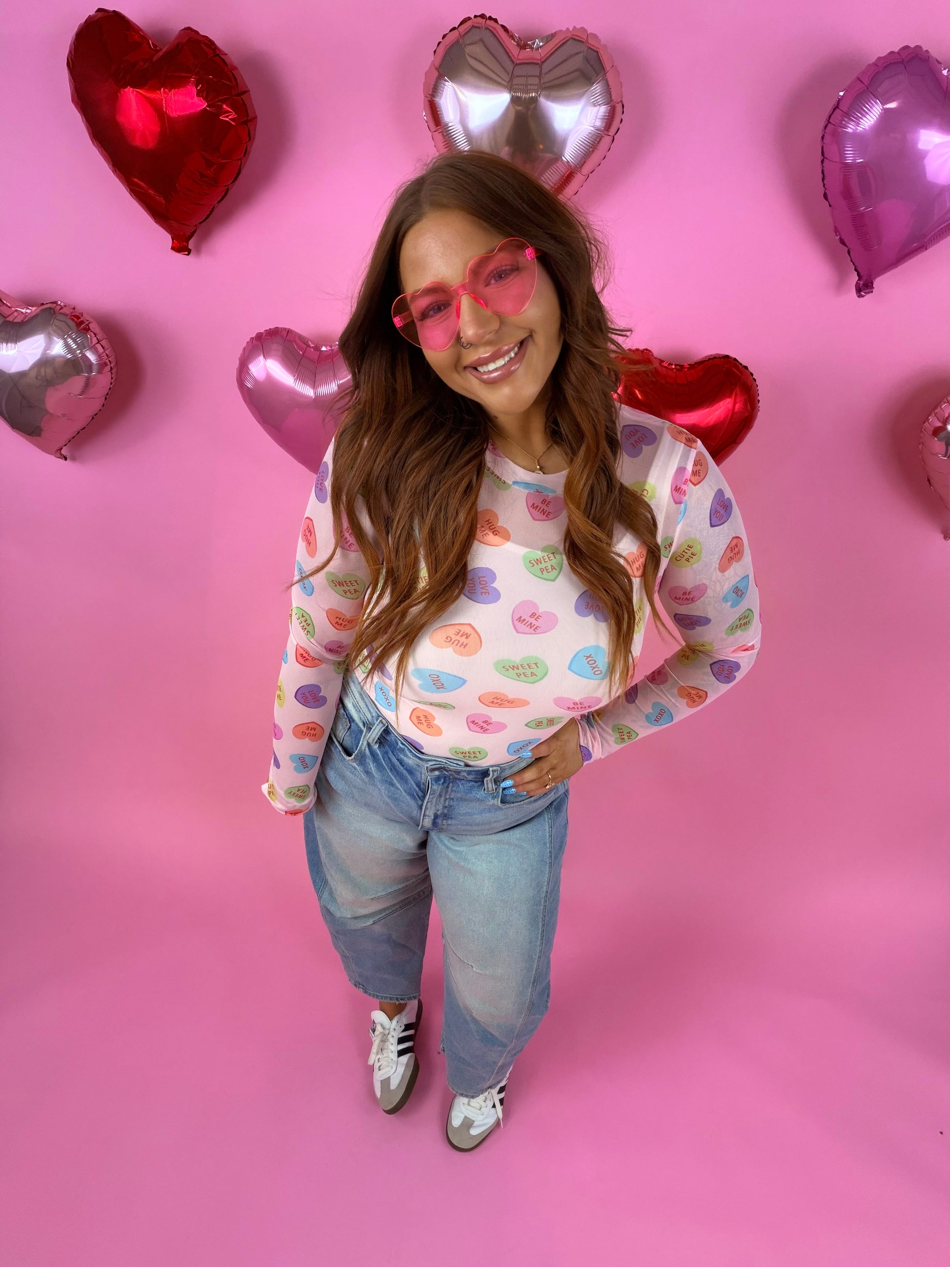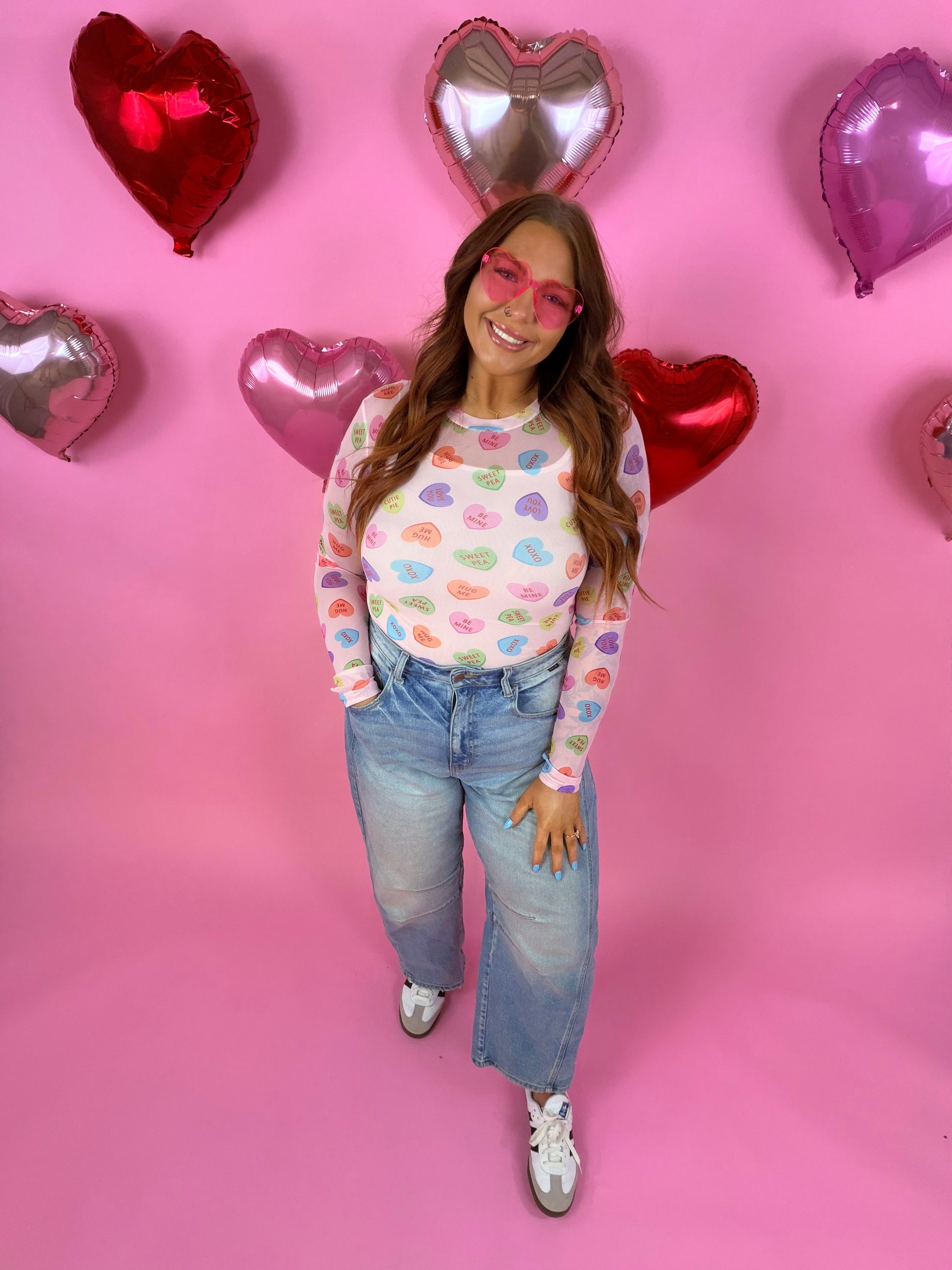 Our Valetines Prints are here!! Super cute for layering, this sultry stretchy mesh print long-sleeve tip features a totally sheer design. Perfect worn alone or paired under your favorite cardigan, vest or sweater! Crew neck and thumbhole details.